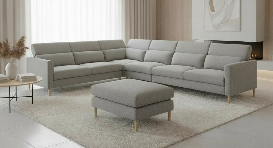 Experience comfort and durability with this spacious corner suite, crafted from hard wearing fabric for everyday use. Available in two versatile neutral tones – charcoal and silver – it blends seamlessly into any modern living space. The design is elevated by sleek timber cylinder legs in a natural finish, adding a touch of warmth and sophistication. For added flexibility, a matching ottoman is also available for creating a complete lounge setting.