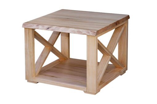 The Stylish timber lamp table is made from Eucalyptus timber for a light, natural touch with live edge and cross piece detailing to complete that modern farmhouse look.