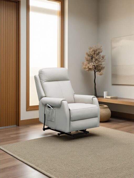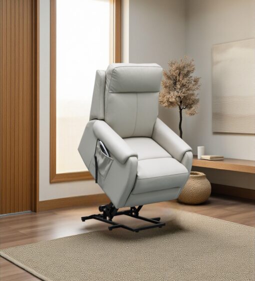 The Lygon dual motor leather lift chair is designed to help you move. With the dual motor mechanism to elevate your lounge experience.Your comfort zone will be found at the touch of a button. The lift action conveniently moves the back rest independently from the foot rest allowing you to adjust to a variety of angles for ease of movement and transitioning from a seated to a standing position and vice versa. 160 kg weight capacity, thick leather that is available in 3 colours black, charcoal and light grey. Comes with battery back-up