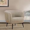 The on trend Scandi style accent chair will be a feature to your living space. It features generous wide-back with stylish button back cushions and plush foam seating. This arm chair will ensure you relax in style. Stunning dark solid timber legs complete the classy look.