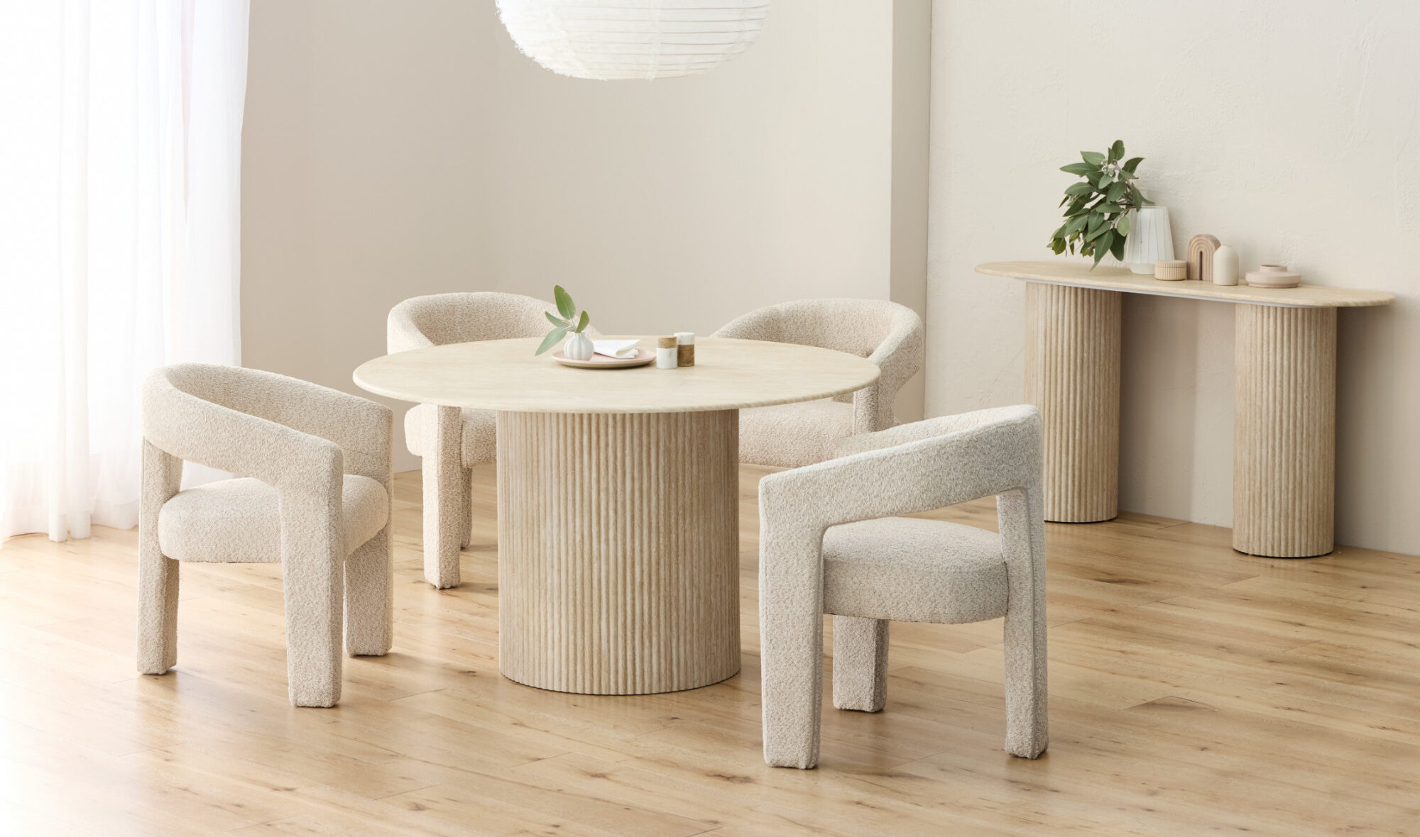 The Pompeii Dining Table is expertly crafted to bring you a unique and stylish addition to your home decor. The stunning stone range travertine look paired with the corrugated MDF base creates a one of a kind piece that will elevate any dining room