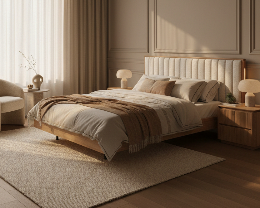 Bring modern sophistication to your bedroom with the Prada Bedroom suite. The Bed frames softly textured, vertical panel upholstered bedhead is beautifully framed in warm timber, creating a refined and inviting aesthetic. For added convenience and style the bed features intergrated lights on each side, offering a practical touch for night time reading or ambience. The matching cases goods feature detailed ribbed pannelled drawer fronts, they add texture and visual interest to any bedroom. The rounded timber edges soften the overall look, creating a seamless blend of style and sophistication. Available in Queen or King size.