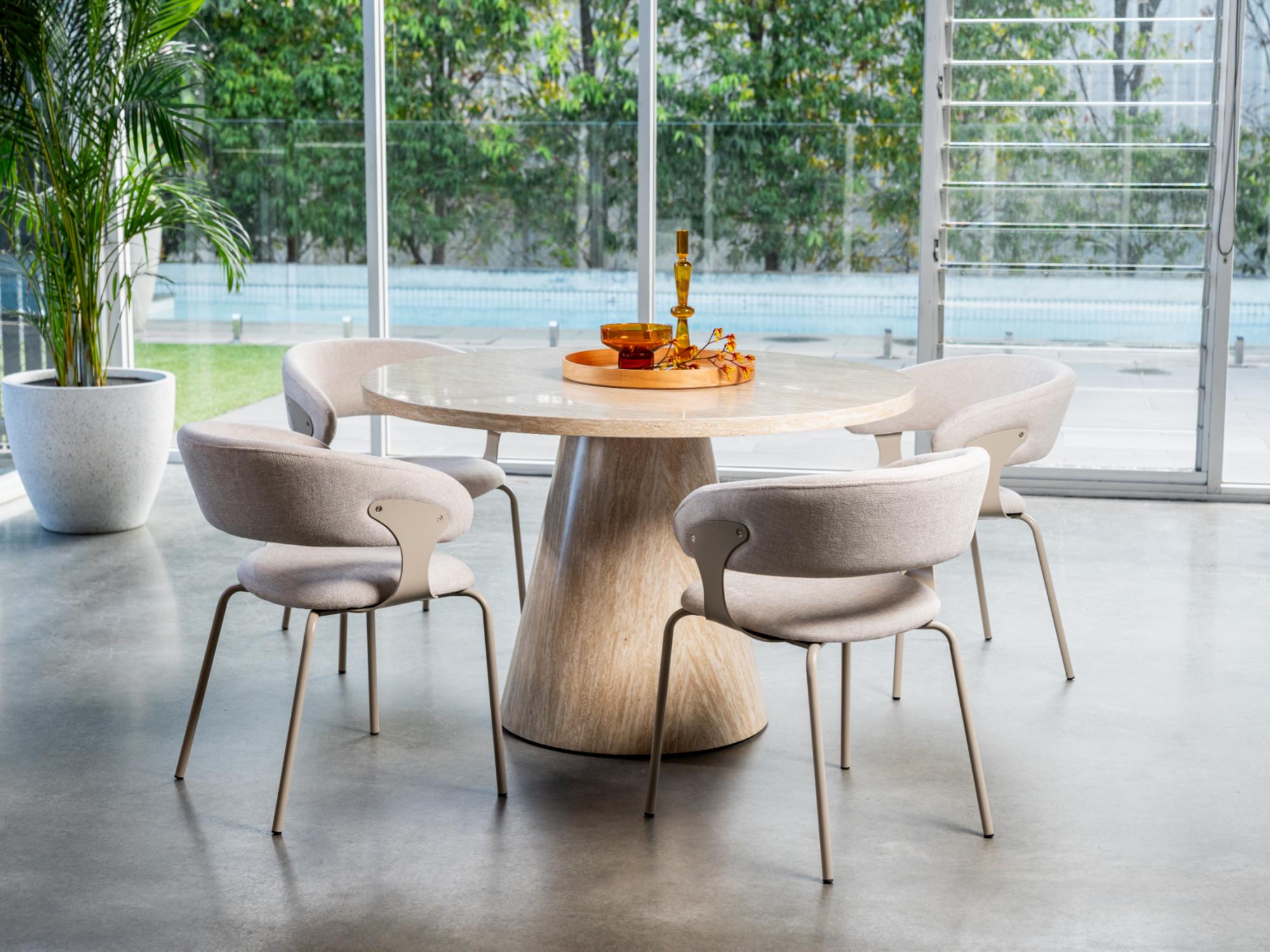 The Tessa – Kenny dining 5 piece dining setting brings classy modern style to your home. Perfect for a dining area and breakfast nook. The round table features a beautiful column in the centre for added visual interest. With its unique travertine look, you’ll love how this elegant piece adds to any decor style. The stone featured finish gives the table a high end look and feel. Enjoy hosting your family and friends at home with the stylish Tessa dining table. Matched with the Kenny dining chair that is designed to deliver a new standard in dining. Its sleek design not only exudes modern sophistication but also ensures lasting comfort for every occasion. Available in two distinct colour ways the Kenny dining chair adapts seamlessly to any dining table and decor, making it the ideal choice for your home.