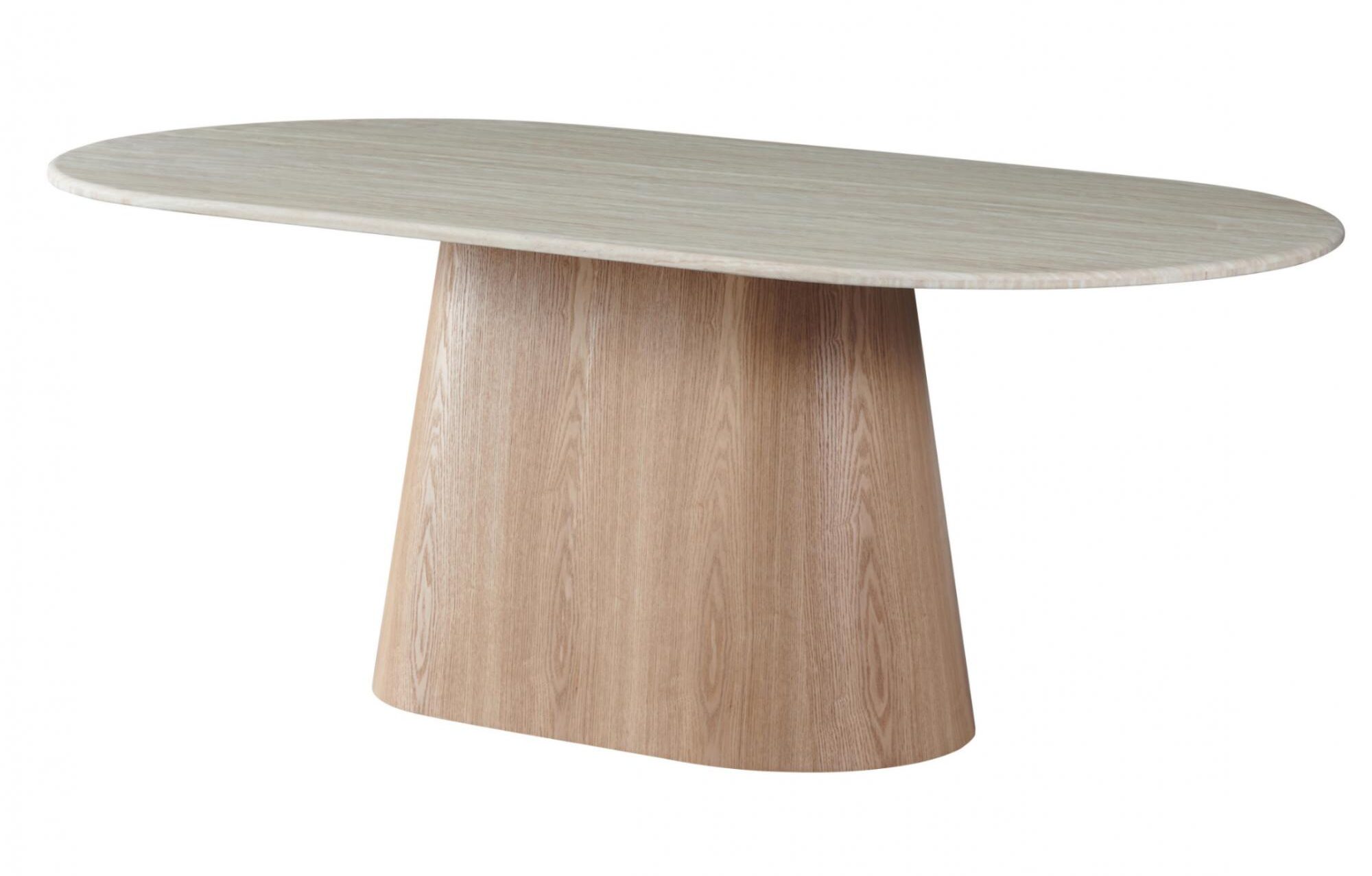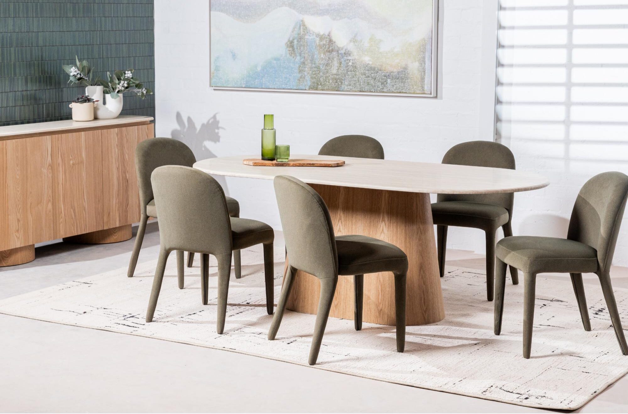 The Waverley – Oasis setting blends organic textures with modern design, creating a collection that feels both timeless and contemporary. The dining table is topped with matte white travertine artificial marble, offering a sophisticated stone look with everyday durability. The body and frame are crafted from ash veneer MDF in a natural finish, adding warmth and elegance. Paired with the sleek and modern Onasis dining chair. The chairs simple design is perfect for those who appreciate a clean and clutter free space, while still adding a touch of elegance to your home.